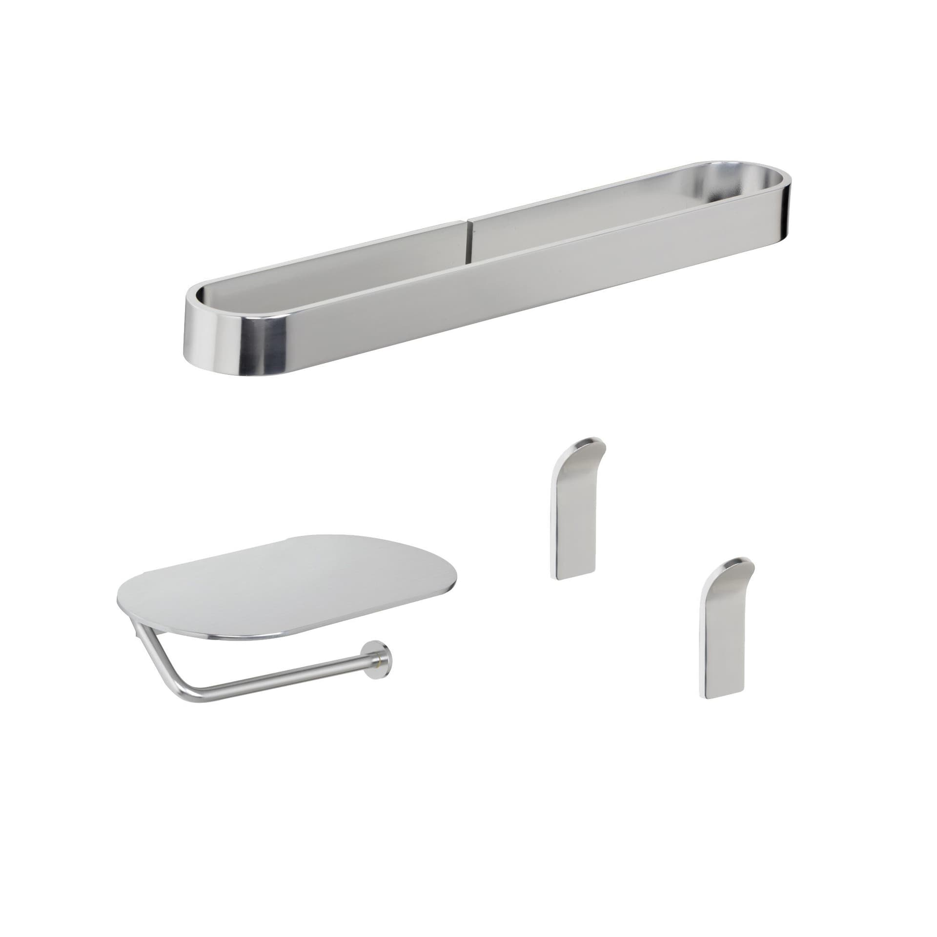 Pack de 4 peces de la sèrie d'accessoris LOOPS en crom: 2 penjadors, 1 porta-rotlles amb prestatge i 1 tovalloler. Si no vols haver de taladrar, aquest pack d'accessoris adhesius és la solució ideal per al teu bany. Una col·lecció diferent, sense suports, nítida i senzilla, que marcarà un tret diferencial al teu bany. Fabricat en alumini anoditzat acabat en cromo semi-brillant, material molt adequat per la seva alta resistència a la humitat. No es recomana col·locar sobre rajoles rugoses o amb moltes juntes.