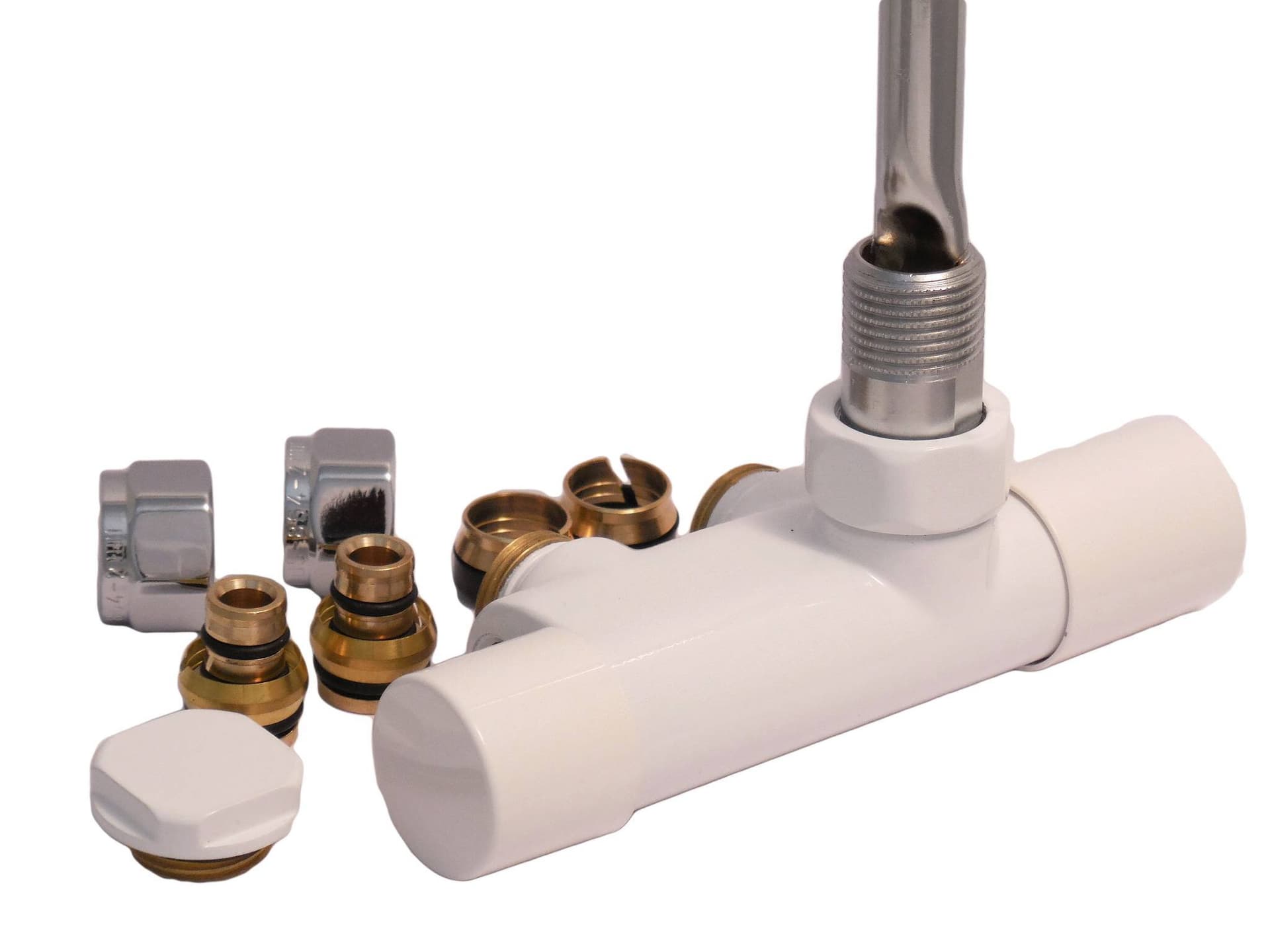 El kit de válvula blanca te ayudará a completar la instalación de tu radiador y mediante el color camuflarlo si no quieres que sea un detalle que destaque. Disponible en más colores.